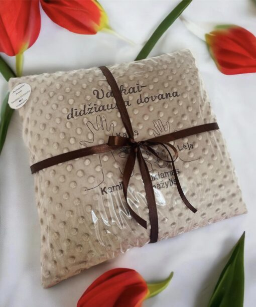 Pagalvėlė gali būti su vardu ar kitu norimu užrašu.