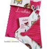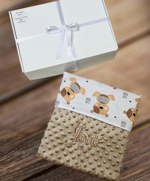 Migdukas 25×25 cm. Viena migduko pusė yra minky su burbuliukais, kita- medvilninė drobelė;Pledukas 75×100 cm. Viena pleduko pusė yra minky su burbuliukais, kita- medvilninė drobelė.