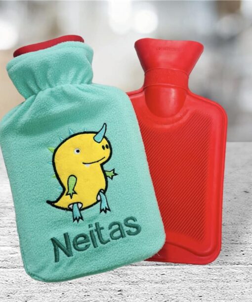 Šildyklė užpildoma vandeniu su fliso audinio užvalkalu ir aplikacija, gali būti su vardu.